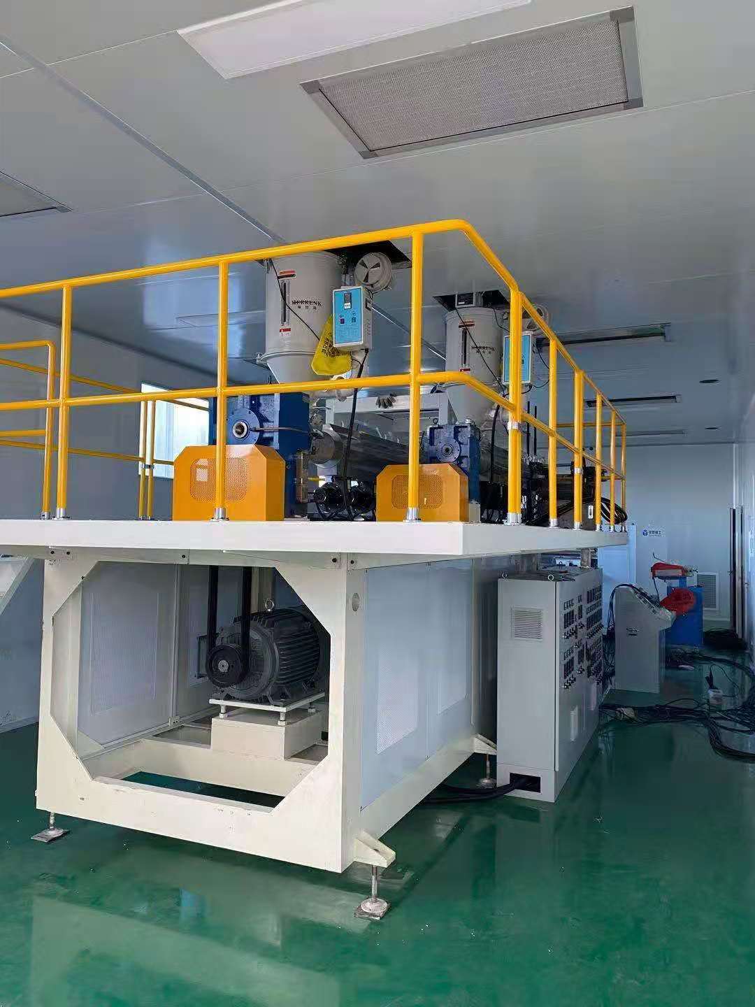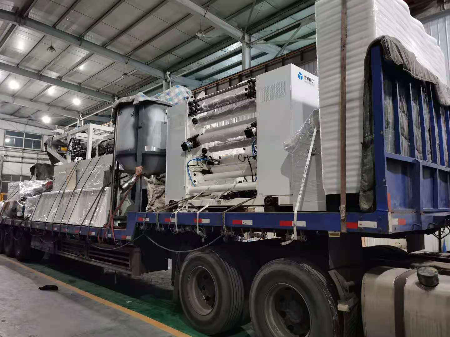 安装完毕。与市面上的流延机相比,本机实现了一机多用的创新。本机是一台多功能流延膜设备,兼具了流延镜面薄膜的生产,广泛应用于包装领域,也拥有膜面压花用于制造手套膜等产品的功能。整机采用PLC全自动监测、显示与控制,双工位全自动不停机换卷。