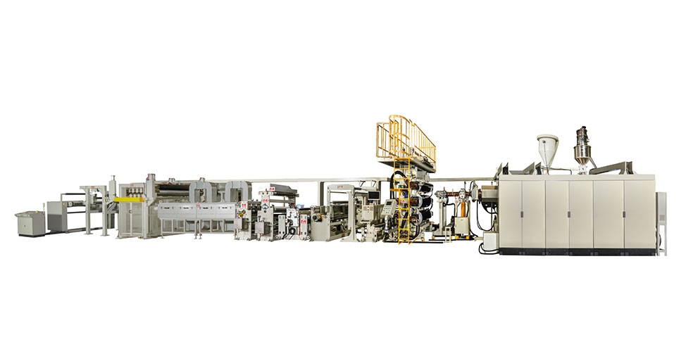 塑料包装片材常用的生产方法有压延法,主要用于生产PVC、PVDC等片材;另一种是挤出法,用于生产BOPS、EPS、PET、PP、HIPS等片材。本文所指的片材主要是指采用 "挤出机-T型机头-三辊压延装置-收卷 "工艺进行热成型包装制品生产的片材。